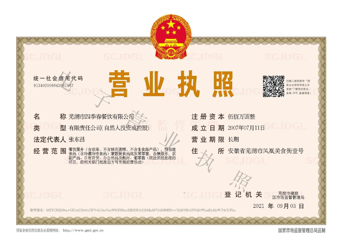 - 四季春餐飲有限公司 基 本 簡(jiǎn) 介 中華老字號(hào)四季春創(chuàng)立于1910年,公司經(jīng)歷數(shù)百年的發(fā)展,其特色的地方小吃,獨(dú)特的菜肴品味,家喻戶(hù)曉,深受江城百姓的喜愛(ài),成為當(dāng)?shù)匕傩张e行家宴、企事業(yè)單位商務(wù)宴請(qǐng)的選擇。四季春餐飲有限公司一店位于鏡湖區(qū)鳳凰美食街1號(hào),二店位于弋江區(qū)大工山路16號(hào)。經(jīng)過(guò)多年努力先后獲得安徽省餐飲名店, “安徽省著名商標(biāo)”,省旅游四星級(jí)餐館,多次參加省、市電視臺(tái)公益活動(dòng),2014年獲...